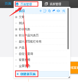 ④.点击下图中的创建新页面,系统将自动创建一个带有文章搜索结果插件或者产品搜索结果插件的页面。