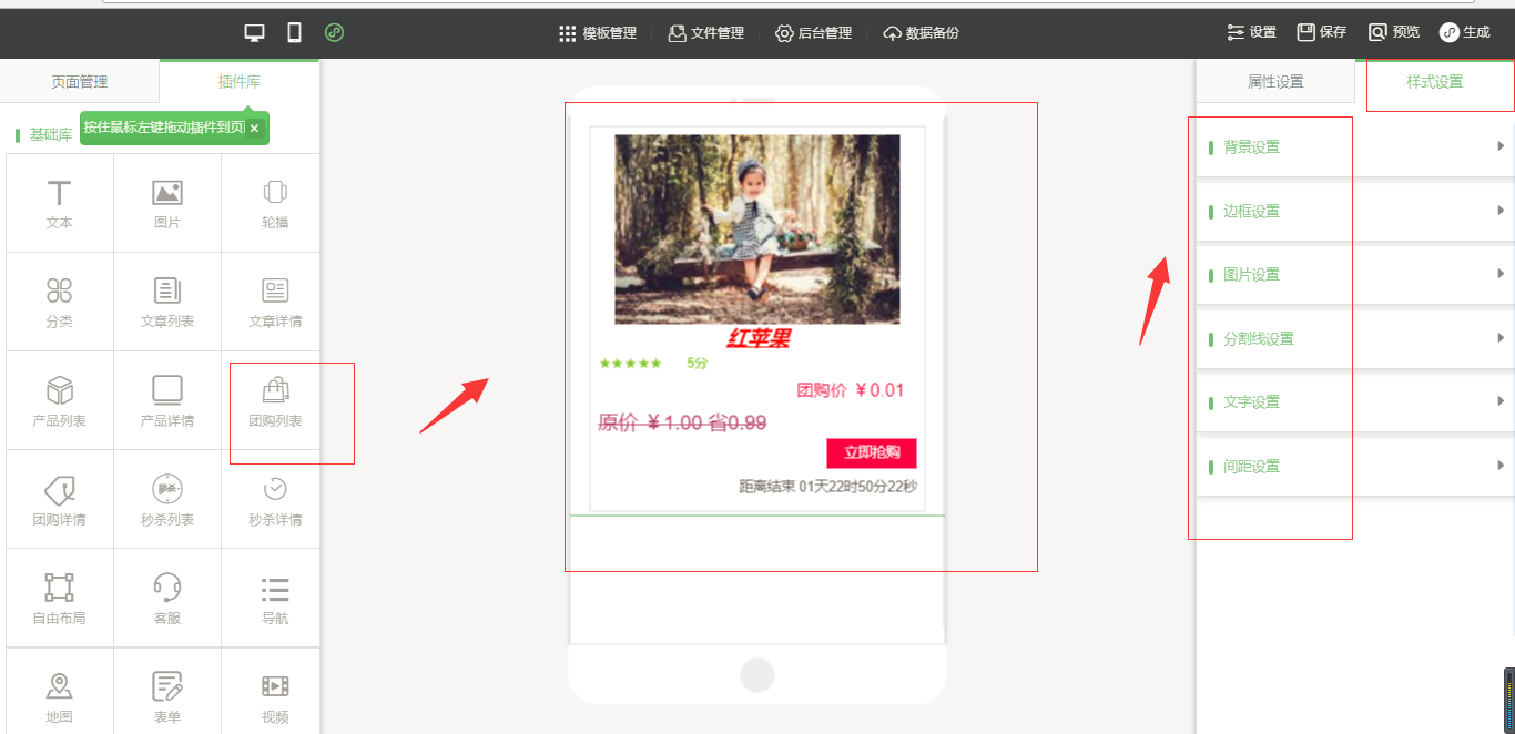 1.点击“后台管理”-“添加产品”-选择“团购”,然后添加产品信息,添加完成之后,点击“保存”,在小程序编辑器中拖入“团购列表”插件。点击选中该插件,在页面的右侧,有“属性设置”和“样式设置”,“属性设置”包括“排序设置”、“显示设置”等、“样式设置”包括“背景设置”、“边框设置”、“文字设置”、“图片设置”、“分割线设置”、“间距设置”,设置完毕后,点击保存,然后新建一个“团购详情”页面,拖入“团购详情”插件,在团购详情中同样也有“属性设置”和“样式设置”,设置完成点击保存,然后返回到“团购列表”中将“链接至”选中团购详情页面,然后点击保存即可,如图所示: